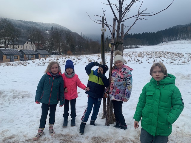 Uczniowie klasy 2 przygotowali smakołyki dla ptaków. Pojemniki po jogurtach wypełnili przygotowaną masą tłuszczową z nasionami i rozwiesili na drzewach. Teraz ptaki nie będą głodować.